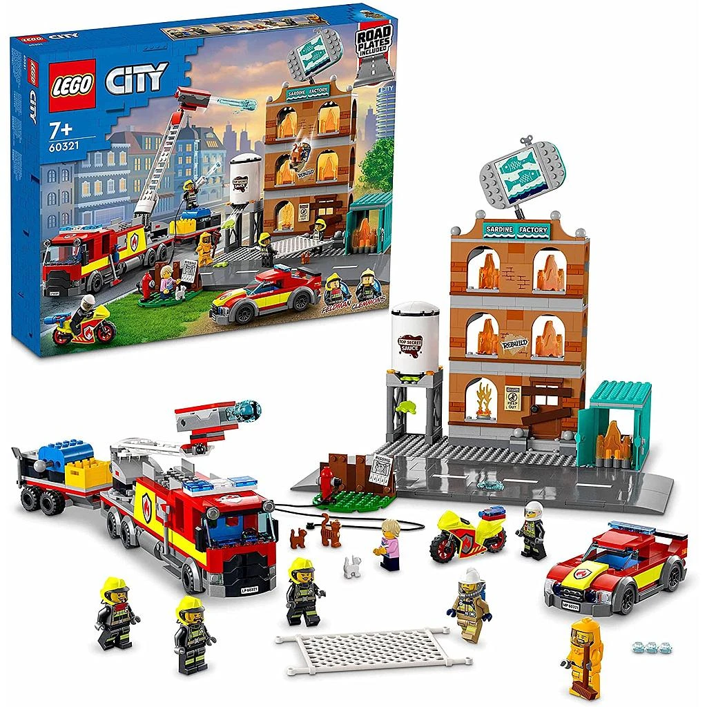 - Cosa c’è nella scatola? Tutto ciò che serve per costruire un’autopompa giocattolo, un rimorchio, una motorbike, un pickup dei pompieri, un incendio alla fabbrica di sardine e altro, oltre a 5 minifigure, un cane, un gatto e 3 gattini