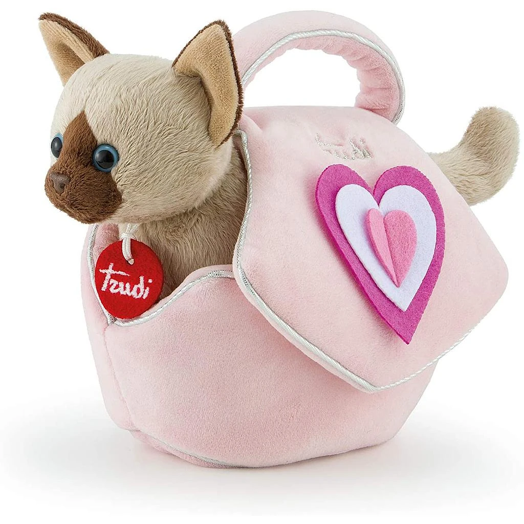 Per tutte le bambine alla moda e dall’animo romantico, ecco una nuova borsetta con la quale portare a spasso il proprio cucciolo di gattino siamese. E’ realizzato in un tono di rosa delicato, con un bordino in argento in contrasto e un delicato cuore tridimensionale