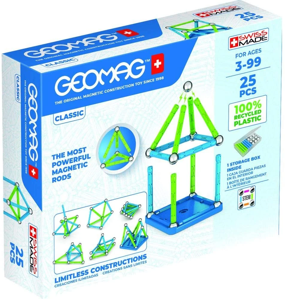 La scatola contiene 12 sfere metalliche, 12 barrette magnetiche verde chiaro, 1 pannello base quadrato blu. Gli elementi sono compatibili con tutte le linee Classic e Panels di Geomag.