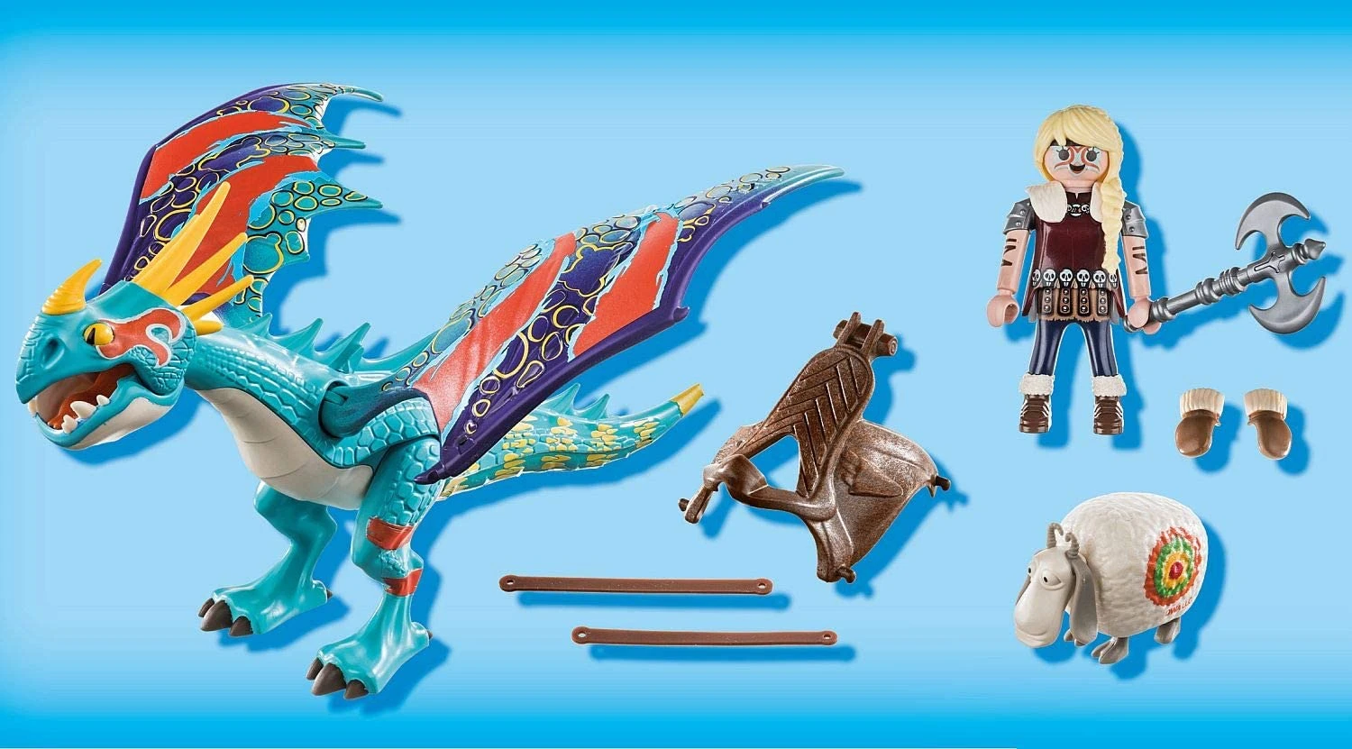 Il set di gioco include Astrid e Tempestosa nei loro abiti Racing, una pecora che gira, una doppia ascia e altri fantastici extra. Astrid può cavalcare Tempestosa. La sella è removibile.