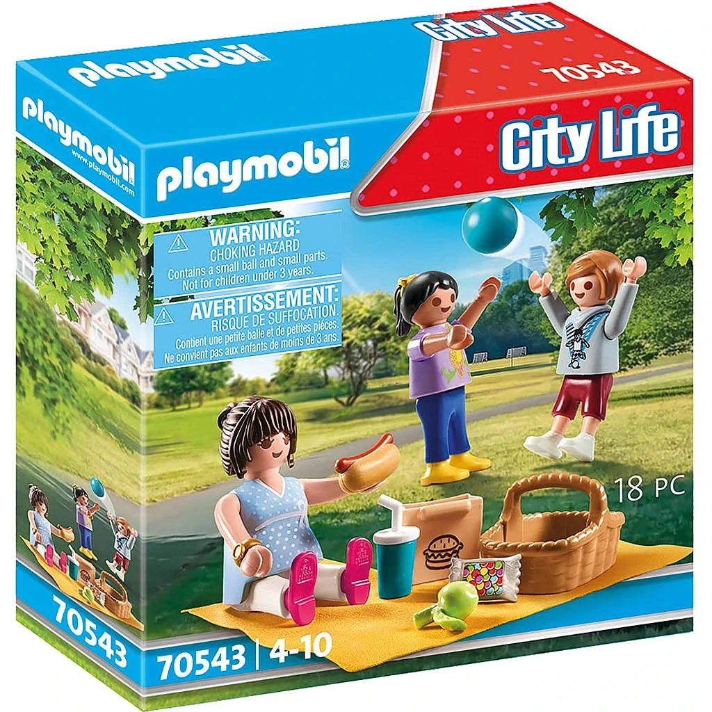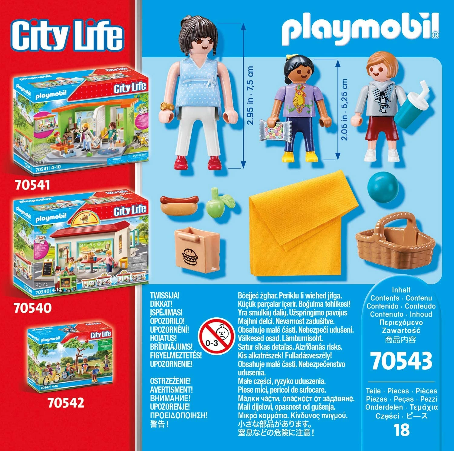 Il set è composto da tre personaggi PLAYMOBIL, una donna incinta e due bambini, un cestino, una palla, una coperta da picnic e molti altri extra per un picnic di successo.