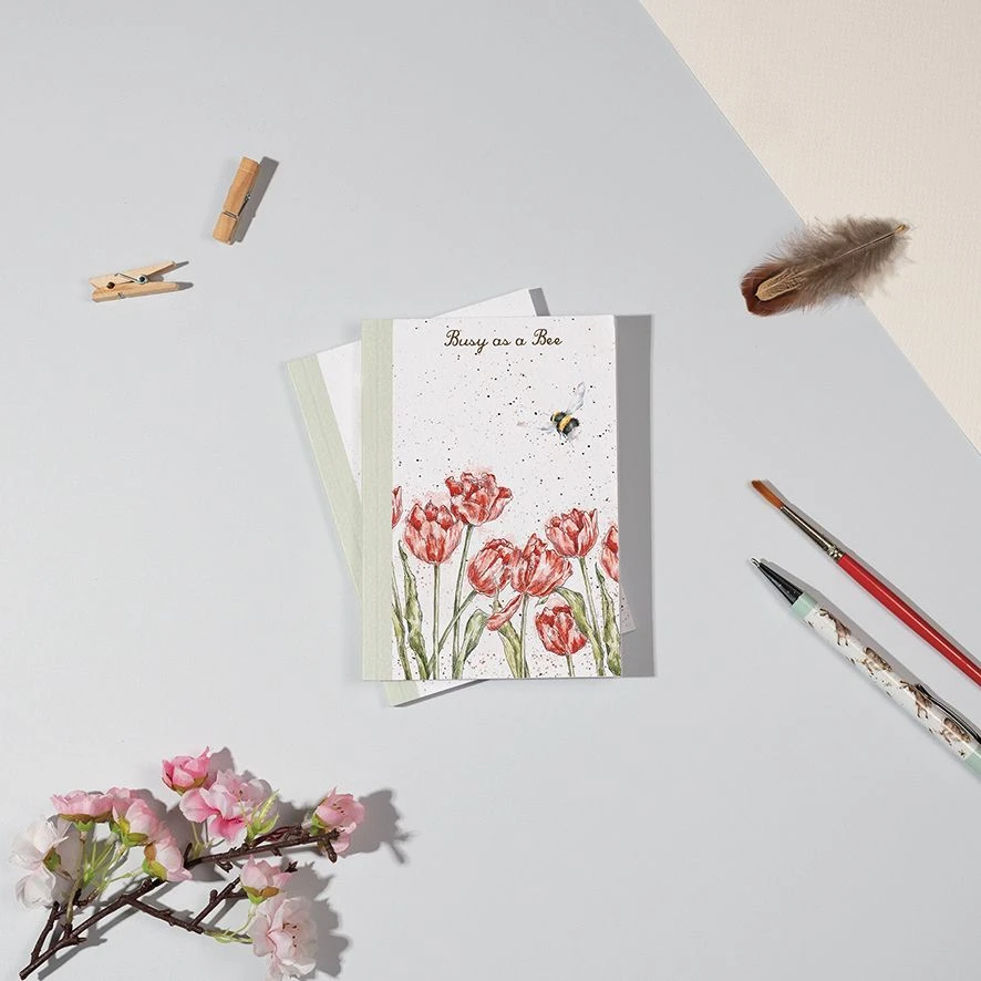 Annota i tuoi appunti con stile con questo taccuino tascabile A6 con un’ape tra i tulipani.