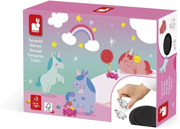 A chi non piacciono gli unicorni? Con questo set di 15 timbri, i piccoli artisti potranno decorare i propri disegni con simpatici unicorni e magnifici arcobaleni, per un viaggio ricco di tenerezza. Un modo ideale per dare libero sfogo alla propria immaginazione creando scene di ogni tipo, ricche di unicorni ed elementi decorativi come fiori e caramelle! Manipolando i timbri, i bambini dai 3 anni in su sviluppano l’immaginazione, la creatività e le abilità fino-motorie. Un’attività ludica e creativa, ideale per trascorrere momenti di tranquillità con la fantasia! Questo set contiene: 15 timbri in gommapiuma e 1 cuscinetto inchiostrato. Questo prodotto è realizzato con materiali certificati FSC® e materiali controllati.