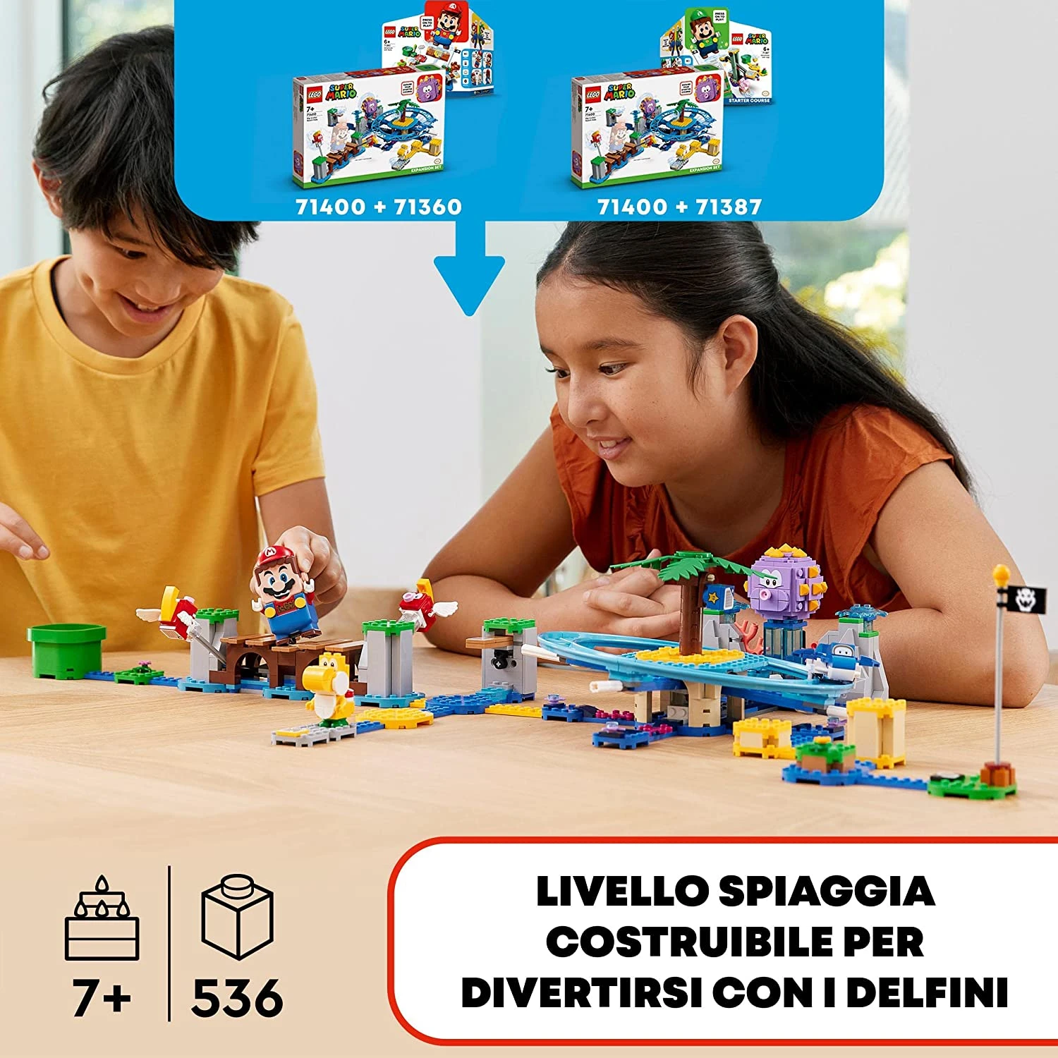 - 5 personaggi giocattolo LEGO® Super Mario™: Yoshi giallo, un Ricciospino gigante, 2 Pesci Smack e un Delfi su cui LEGO® Mario™ o LEGO® Luigi™ (personaggi non inclusi) possono salire