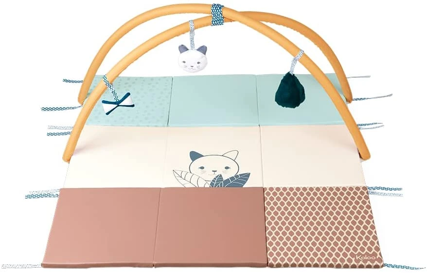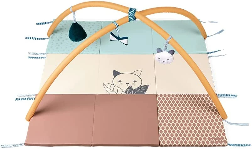 Il tappeto include degli archi in gommapiuma removibili (alti 44 cm dopo averli fissati) a cui è possibile agganciare i tre accessori dai materiali variegati: I colori, i tessuti e le stampe a contrasto sono stati progettati per stimolare le scoperte sensoriali del neonato.